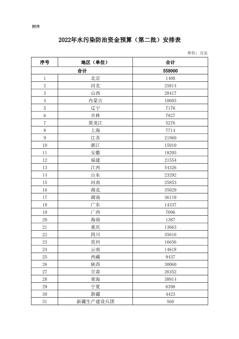 6月17日,財政部發布關于下達2022年度水污染防治資金預算(第二批)的通知,合計55.8億元,詳情如下: