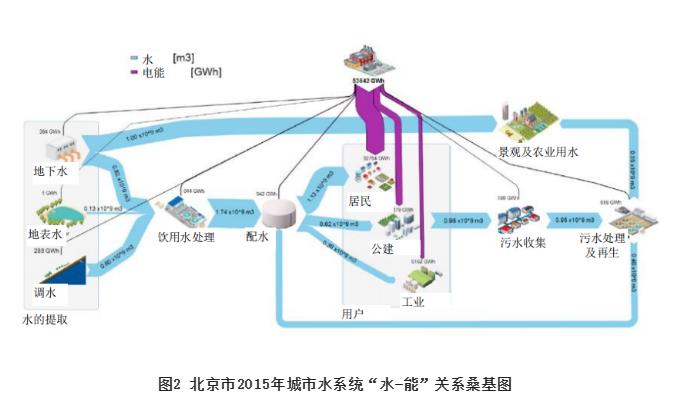 圖2所示給出了北京2015年水系統(tǒng)水量與能耗分配關(guān)系桑基圖,可以評估城市“水足跡”過程及能量消耗,在城市尺度上系統(tǒng)評估和多目標(biāo)優(yōu)化“水-能”關(guān)系,通過水系統(tǒng)全流程過程系統(tǒng)規(guī)劃、聚焦水循環(huán)每個鏈條,進(jìn)行傳統(tǒng)工藝改進(jìn)、高效設(shè)備及革新性工藝技術(shù)應(yīng)用,尤其是對排水系統(tǒng)結(jié)構(gòu)優(yōu)化進(jìn)而提升系統(tǒng)能源利用效率,因地制宜地采用污水中資源、能量回收以及清潔能源提取和利用等技術(shù)措施,進(jìn)一步降低水系統(tǒng)能耗和溫室氣體排放,對于提升水系統(tǒng)韌性及可持續(xù)至關(guān)重要。