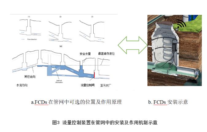 國外的研究和實際案例表明,基于整個排水系統(tǒng)的拓?fù)浣Y(jié)構(gòu),結(jié)合管網(wǎng)水力模擬等手段,選擇在管網(wǎng)關(guān)鍵節(jié)點處設(shè)置流量控制設(shè)備,通過布局策略、具體安裝數(shù)量和位置優(yōu)化,可以實現(xiàn)雨季對管網(wǎng)在線調(diào)蓄能力的充分利用,并實時減少CSO及下游管網(wǎng)的流量壓力,見圖3。我國室外排水設(shè)計標(biāo)準(zhǔn)缺少在城鎮(zhèn)排水管網(wǎng)適當(dāng)位置設(shè)置流量控制調(diào)節(jié)設(shè)施、設(shè)備等方面的具體技術(shù)要求或建議,因此,實際項目設(shè)計往往沒有考慮對排水系統(tǒng)流量主動控制與優(yōu)化分配的必要性,導(dǎo)致暴雨期間無法實現(xiàn)對整個排水管網(wǎng)不同位置或區(qū)域的下泄流量和流速的有效控制,以及短時下游管網(wǎng)承受來自上游管網(wǎng)超量的流量沖擊進(jìn)而使得下游排水區(qū)域的排水不暢、內(nèi)澇及CSO等現(xiàn)象,甚至在管網(wǎng)薄弱環(huán)節(jié)出現(xiàn)突發(fā)性的滿溢和洪澇災(zāi)害;同時,由于管網(wǎng)中缺乏FCDs,不能充分發(fā)揮管網(wǎng)應(yīng)有的在線調(diào)蓄能力,對末端流量控制易造成瞬時沖擊和壓力。實際上,分布式的流量控制設(shè)備相對大規(guī)模灰色基礎(chǔ)設(shè)施建設(shè)更加經(jīng)濟(jì)、易于實施、可持續(xù),因此,改進(jìn)傳統(tǒng)排水管網(wǎng)被動接收的排水模式,通過設(shè)置必要的在線流量控制裝置實現(xiàn)排水系統(tǒng)峰值流量管控,向“空間”換“時間”的主動控制方向轉(zhuǎn)變,對于增加汛期排洪防澇的靈活性、提升排水系統(tǒng)韌性和可靠性等方面至關(guān)重要。