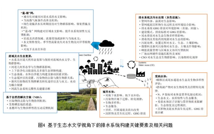 傳統(tǒng)城市排水系統(tǒng)的規(guī)劃、設(shè)計與實施環(huán)節(jié)可歸結(jié)為“水量”和“水質(zhì)”兩個維度,缺乏跨學(xué)科性且統(tǒng)籌不足,因此在規(guī)劃設(shè)計中融入生態(tài)水文措施可以彌補(bǔ)傳統(tǒng)排水設(shè)施的剛性缺欠。近年來,在“海綿城市”理念引領(lǐng)下,一些基于自然的解決方案(Nature-based solutions ,NBS) 得到應(yīng)用。盡管NBS是為特定目的而設(shè)計的(如城市排水),但它可以同時提供多種生態(tài)系統(tǒng)服務(wù),如雨水自然處理和滲濾、蒸發(fā)和生物多樣性保持等。通過對近些年的一些實踐案例調(diào)研發(fā)現(xiàn),個別具有“生態(tài)”特征的綠色基礎(chǔ)設(shè)施項目,從“現(xiàn)代生態(tài)水文學(xué)”角度來評價,則會發(fā)現(xiàn)其在城市水文、生物多樣性及水生態(tài)服務(wù)等維度上缺乏系統(tǒng)性統(tǒng)籌,因此,應(yīng)從排水系統(tǒng)或者全域水資源系統(tǒng)管理角度,充分考慮水的社會循環(huán)擾動對自然水文及生物多樣性的影響。城市級流域尺度上水系統(tǒng)不同要素之間的關(guān)聯(lián)及相互作用關(guān)系見圖4。