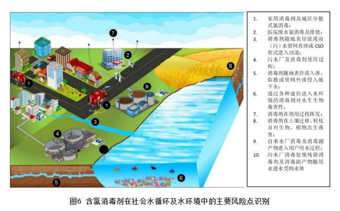近些年來,隨著各地污水排放標(biāo)準(zhǔn)對糞大腸桿菌群指標(biāo)要求的提高,污水處理過程中往往會過量投加含氯消毒劑,可能導(dǎo)致污水生物毒性顯著增強(qiáng)的問題,這是因為消毒劑能夠與水中含有的人工或天然溶解性有機(jī)物(NOM)發(fā)生氯化反應(yīng)生成大量鹵代消毒副產(chǎn)物(HDBPs)并排放到受納水體。此外,不同于給水水源,污水廠尾水殘留較高濃度的含氮素有機(jī)物發(fā)生氯化反應(yīng)后還會產(chǎn)生含氮的HDBPs,如鹵乙腈、鹵硝基甲烷和N-亞硝基二甲胺(NDMA)等具有更強(qiáng)三致活性的物質(zhì);污水中溴化物濃度通常也遠(yuǎn)高于飲用水水源,因此尾水消毒過程也會產(chǎn)生大量具有更高“三致” 活性的溴代DBPs;同時,因過量投加生成的部分消毒劑及其水解產(chǎn)物也會隨尾水排放到受納水體,不同種類的DBPs可以在排放口下游河道數(shù)km~數(shù)十km范圍內(nèi)被檢測到,甚至三鹵甲烷沿程在一定區(qū)間內(nèi)沿程濃度呈現(xiàn)逐漸提高趨勢。顯然,長距離、長周期的各類DBPs和殘留消毒劑的存在,會持續(xù)破壞水環(huán)境功能及微生物菌群結(jié)構(gòu),并對水生生物(魚類、貝類等)產(chǎn)生急性、亞急性毒性效應(yīng),對水生植物產(chǎn)生直接破壞作用,進(jìn)而持續(xù)破壞水生生態(tài)系統(tǒng)平衡,導(dǎo)致微生物生態(tài)系統(tǒng)結(jié)構(gòu)性及功能性改變,受納水體及下游水環(huán)境生物多樣性消失。倘若這些含有DBPs“毒性”增強(qiáng)的尾水被直接或間接排放到飲用水水源,其對飲用水水源地水質(zhì)安全性直接構(gòu)成嚴(yán)重威脅(氯化消毒及產(chǎn)物足跡與歸宿見圖6)。近些年來,據(jù)調(diào)研,我國一些執(zhí)行高排放標(biāo)準(zhǔn)的污水項目,其尾水排放河道及水環(huán)境生物多樣性反而比提標(biāo)前大幅減少甚至魚蝦皆無,這種高藥耗、高能耗換取的所謂“高品質(zhì)水”其生態(tài)價值值得深入探究。