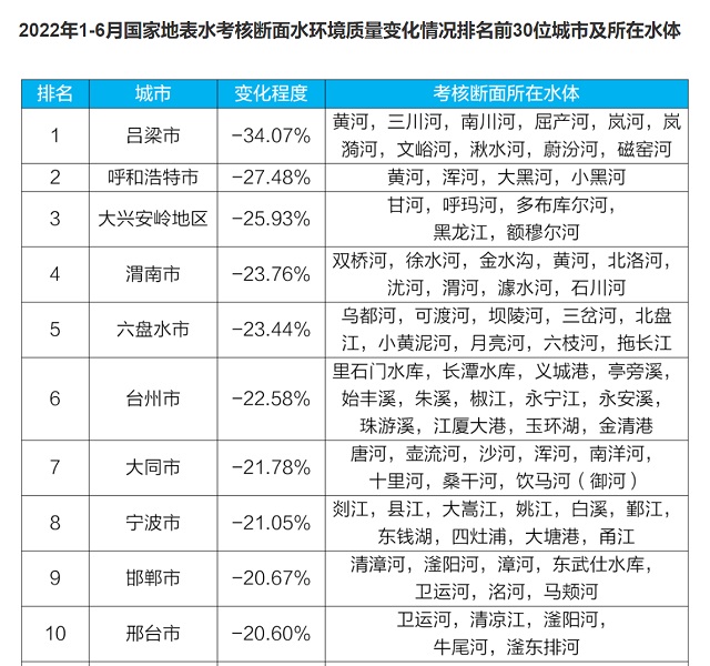 半年榜單中,哪地水質(zhì)改善幅度最大?
