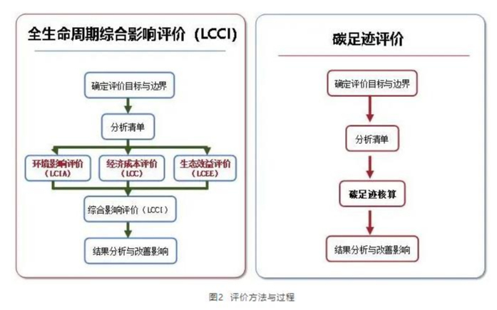 評價方法采用全生命周期綜合影響指標(LCCI,見參考文獻1)與碳足跡核算評價方法(見參考文獻2),評價方法與過程如圖2所示。