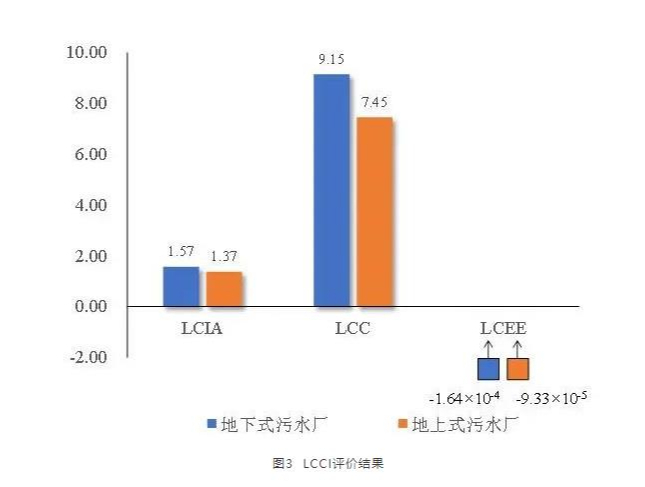 案例污水廠LCCI評價結果如圖3所示。在本研究規定的全生命周期內,地下廠與地上廠對環境與社會產生的綜合影響為LCCI地下式=10.7 > LCCI地上式=8.83。結果顯示,地下式污水處理廠產生的綜合影響較地上式高出21%。地下式污水處理廠對環境、投資的影響均高于地上式,不利于地廠可持續運行。其它表園林景觀確實具有一定生態效益,但與其負面環境影響相比顯然遠無法實現效益“中和”。但是,如果地面非園林景觀,則不具任何生態效益。