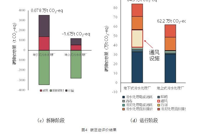 案例污水處理廠全生命周期碳足跡評價結果如圖4所示。地下廠全生命周期總碳排放量約87.1 萬t CO2-eq,較地上廠高36.5%,其中,運行階段碳排放量可達總量的95%以上。由于地下工程結構,地下廠在建設(圖6b)與拆除階段(圖6c)中,需要額外的施工量與建材消耗;在運行階段(圖6c),則需額外通風、照明等電力消耗。因此,地下廠運行階段(20年)總碳排放量較地上式高35.8%;其中,地下廠額外通風產生的碳排放量約18.4萬t CO2-eq,占總排放量的22%??梢姡叵率轿鬯幚韽S全生命周期中會產生大量碳排放,不符合碳減排、碳中和的社會發展方向。