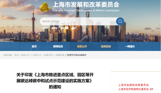 《上海市推進重點區域、園區等開展碳達峰碳中和試點示范建設的實施方案》印發