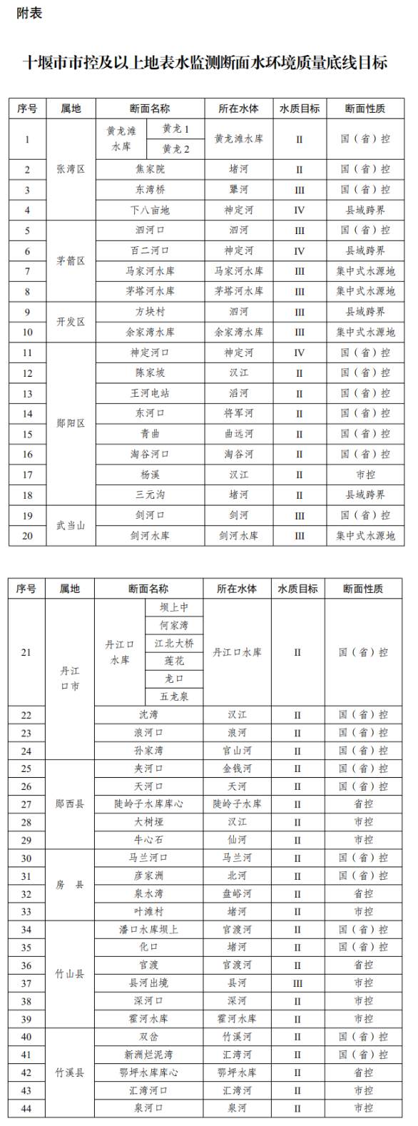 附表:十堰市市控及以上地表水監(jiān)測斷面水環(huán)境質(zhì)量底線目標