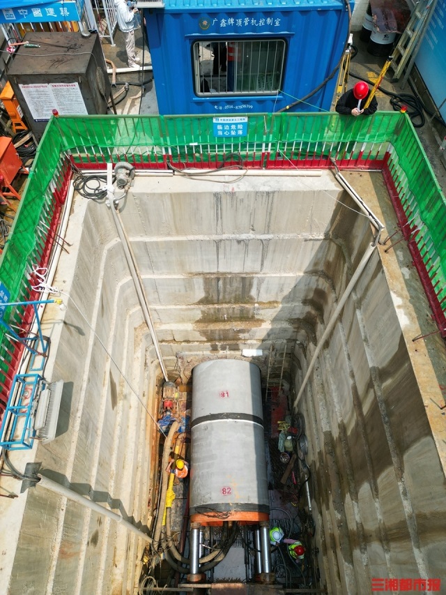 由長沙市芙蓉區朝陽路的一處圍擋而入,映入眼簾的是一處深基坑工作井。井深10米,井底有一條直徑2米、長267米的管道正在施工。三湘都市報記者隨后系上安全帶,佩戴防墜器,沿著梯子向下來到管道口。路面之上,車水馬龍,10米之下,只能隱約能聽到管道內作業人員施工的聲音。