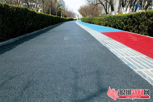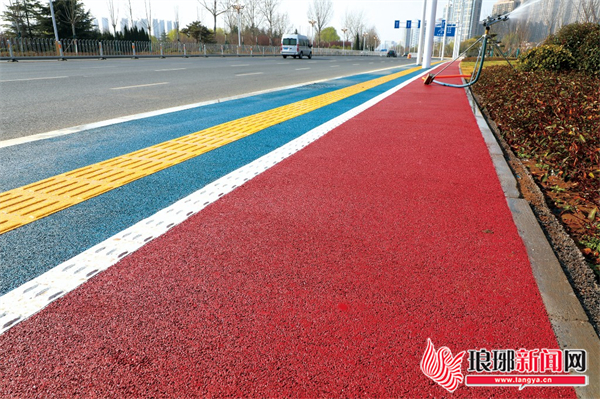 武漢路(蒙河路-沂蒙路)人行道改造工程全長(zhǎng)400米,寬3米,面積1200平方米。工程采用透水混凝土工藝進(jìn)行鋪設(shè),結(jié)構(gòu)層為10厘米透水混凝土基層加5厘米彩色透水混凝土面層,有效提高城市道路的雨水滲透能力、高散熱性能和景觀功能。
