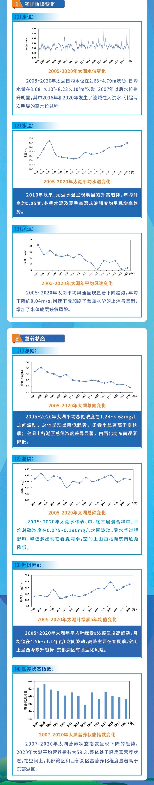 作為我國第三大淡水湖,太湖是長三角地區重要的水資源調配中心,是上海、蘇州、無錫、湖州等城市的主要飲用水水源地,年供水量約12億m3。2005-2020年間,太湖地理環境、營養狀態、生態系統結構和演化趨勢等方面發生了什么樣的變化?近日,中國科學院南京地理與湖泊研究所發布《中國湖泊生態環境研究報告》系列,以數據可視化、敘述科普化的方式,呈現中國重要湖泊的現狀,診斷生態環境狀況和發展趨勢,提出湖泊及其流域在生態環境保護、治理和修復方面的對策與建議。