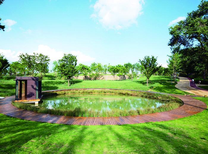 項(xiàng)目在設(shè)計(jì)時(shí)利用數(shù)據(jù)模型研究地表徑流、生態(tài)廊道,對(duì)挖、填方以及可能存在的生態(tài)風(fēng)險(xiǎn)進(jìn)行判定,在重要節(jié)點(diǎn)結(jié)合地形地貌與功能性質(zhì),因地制宜地進(jìn)行改善。場(chǎng)地內(nèi)原有兩處低洼區(qū),積水來(lái)源于周邊地形帶來(lái)的地表徑流和降雨,夏季洪澇嚴(yán)重。通過(guò)將東側(cè)低洼坑塘轉(zhuǎn)化為“潮汐湖”花園,搭配圍合景墻和水生態(tài)植被,既滿足兒童的戲水需求,又兼顧雨水收集調(diào)蓄的生態(tài)功能;西側(cè)地勢(shì)低洼區(qū)積水嚴(yán)重,不適宜布置住宅建筑,早期規(guī)劃沒(méi)有正確理解人地關(guān)系,此次通過(guò)將原有的老舊民宅移除,建造成一處雨水花園,充分體現(xiàn)海綿城市“滲、滯、蓄、凈、用、排”六字方針。項(xiàng)目以生態(tài)方法蓄水、凈水,需要時(shí)將水加以利用。被木棧道和燈芯草環(huán)繞的雨水花園和外形簡(jiǎn)潔的景觀亭成為這一片區(qū)的視覺(jué)中心。公園整體形成了適應(yīng)自然的動(dòng)態(tài)景觀,展現(xiàn)了真實(shí)的自然狀態(tài)。