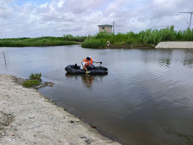 圖為太湖東海局監(jiān)測(cè)與科研中心工作人員乘皮劃艇搭載側(cè)掃聲吶排查水下排污口