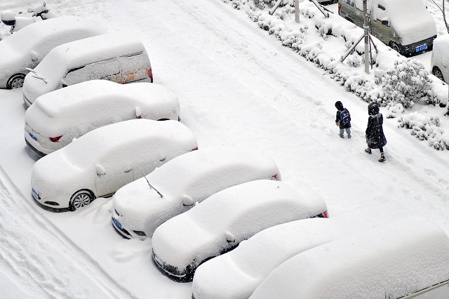 圖為山東省煙臺(tái)市福山區(qū)市民在雪中出行。圖源人民圖片網(wǎng)