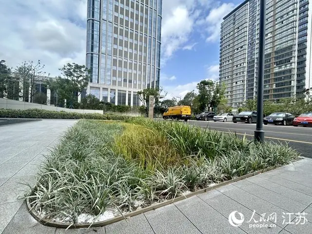 走進揚州建工科技園內(nèi)的綠地,會發(fā)現(xiàn)一些高出植物的黑色噴頭,這是與雨水回收系統(tǒng)聯(lián)動的自動灌溉系統(tǒng)。這塊吸滿了水的大“海綿”,不僅可以緩解城市熱島效應,增加地塊的生態(tài)調(diào)蓄功能,還將滯留和凈化后的雨水用于園區(qū)綠化澆灌和道路噴灑。