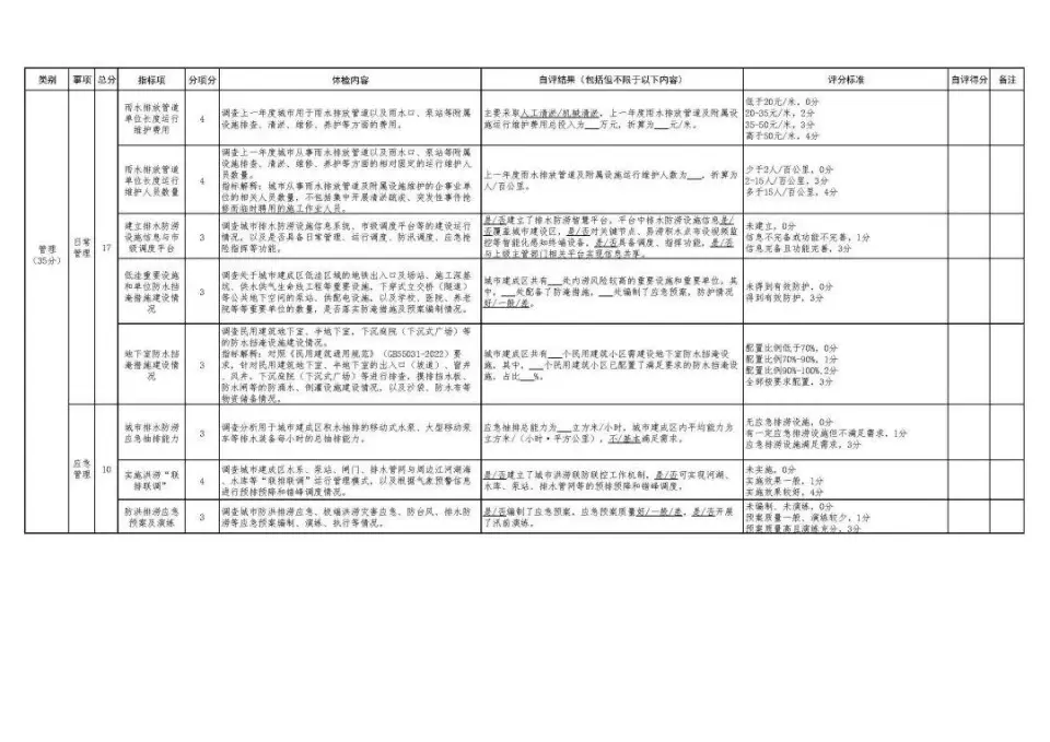 為深入貫徹落實黨中央、國務院決策部署,建立城市內澇治理評估機制,我們在2024年組織開展城市排水防澇專項體檢自評估的基礎上,研究更新了《城市排水防澇專項體檢指標表(2025年)》(見附件,以下簡稱“指標表”),現印發給你們。請你們結合2025年汛前準備、隱患排查等工作,組織開展城市排水防澇專項體檢自評估,全面排查城市防洪排澇體系的問題短板和薄弱環節。專項體檢要覆蓋全部城市(包括地級及以上城市、縣級市,不含下轄縣、鄉、鎮)。針對體檢發現的問題,屬于本部門的,要明確措施和整改時限,持續推進解決;需要相關部門解決的,城市建設(排水)部門要報告屬地政府,及時反饋和移交。