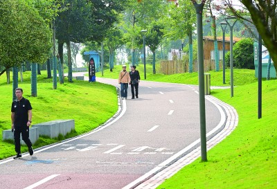市民在四川宜賓市南溪濱江濕地公園綠道內散步。新華社發