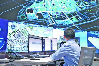 工作人員在中新天津生態城智慧城市運營中心內監控。新華社發