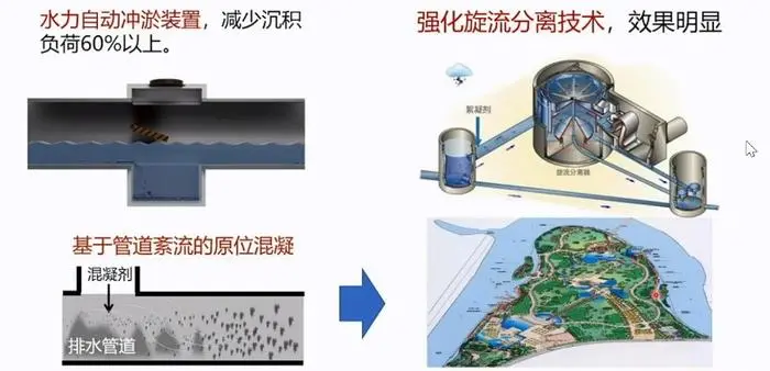 關于降低雨季溢流污染,徐祖信表示,溢流污染調蓄必須基于排放水質的實時調控。如果基于水量調控,難以截流到濃度高的雨污混合水,而基于水質調控可以基于濃度確定調蓄池開啟節點,選擇性截流濃度高的雨污混合水。解決溢流污染問題,源頭控制、末端攔截及生態處理也是重要措施。