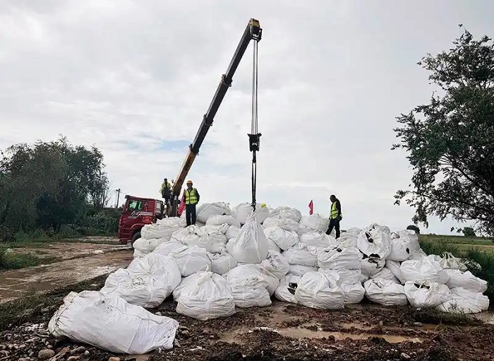 內(nèi)蒙古包頭市土默特右旗的搶險(xiǎn)人員加快調(diào)運(yùn)噸包等防汛物資(2025年8月10日攝)王靖攝